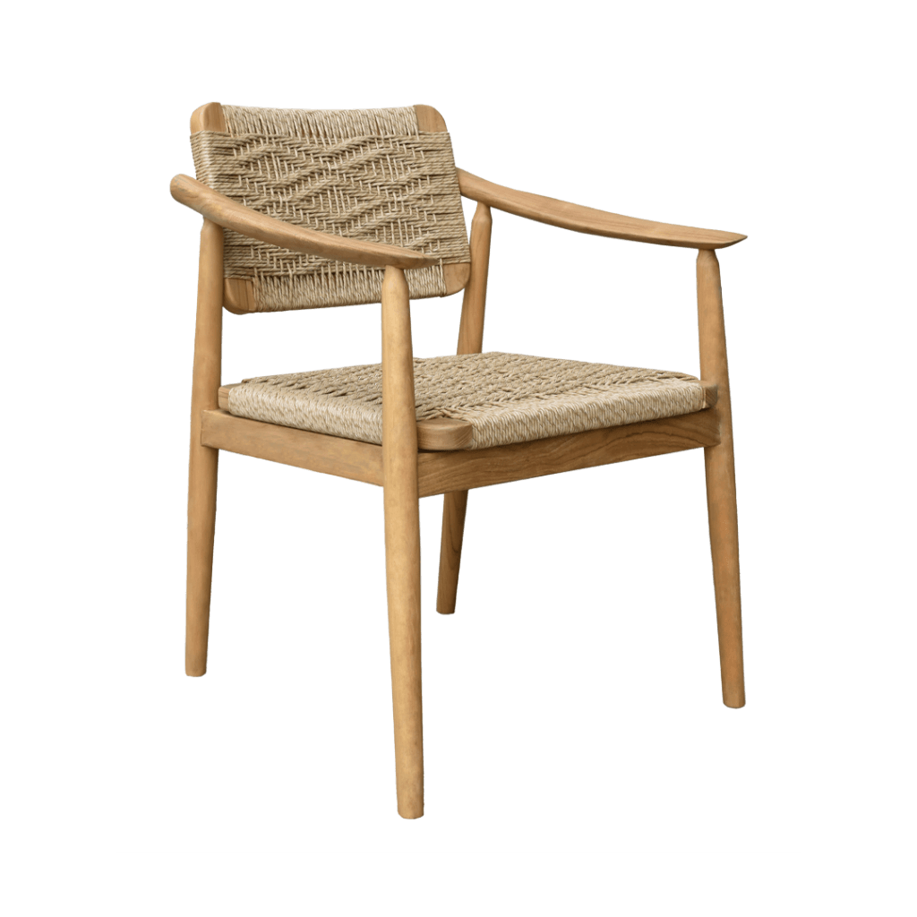 Distinguished by its sophisticated cross-weave pattern, this dining chair brings texture and visual interest to any dining space. Each chair is thoughtfully constructed with angled armrests and an ergonomic backrest that provides optimal comfort for extended dining experiences.
