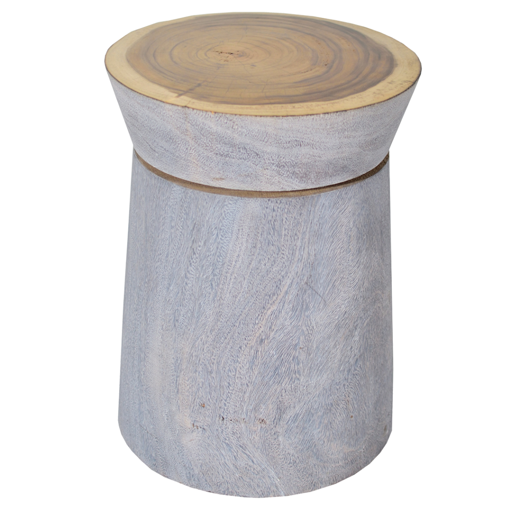 The design maintains a classic drum shape with a slight taper, creating visual interest and ensuring stability. This unique suar wood stool combines traditional craftsmanship with contemporary styling through its distinctive two-tone finish, showing contrast between the natural wood top and grey base that works well in both modern and transitional interiors.