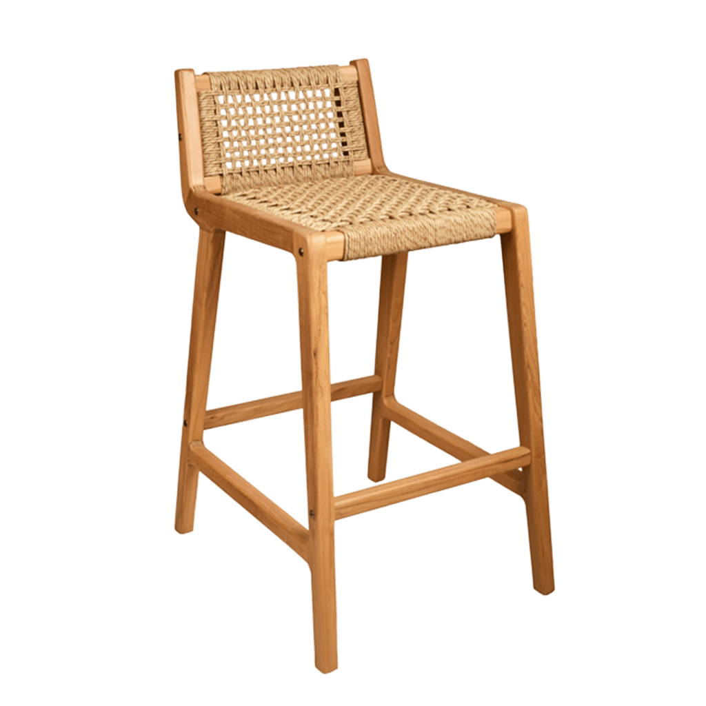 The Lorena Bar Chair offers a unique blend of contemporary style and natural elements, featuring a woven synthetic rattan seat and a sturdy wood frame. Perfect for enhancing your kitchen or patio with a modern touch.