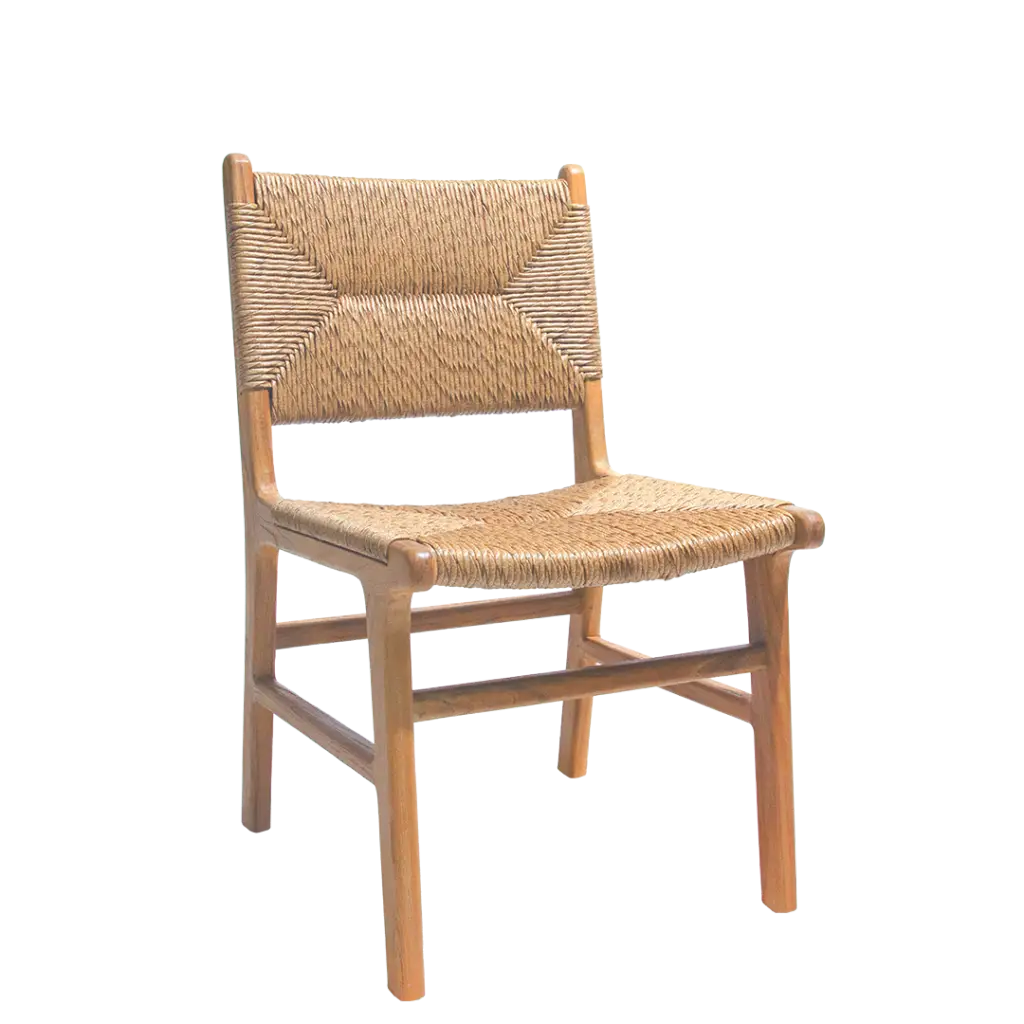 The Harris Dining Chair combines modern design with classic elegance, featuring a beautiful envelope weave of rattan and a sturdy wood frame, perfect for any dining room.