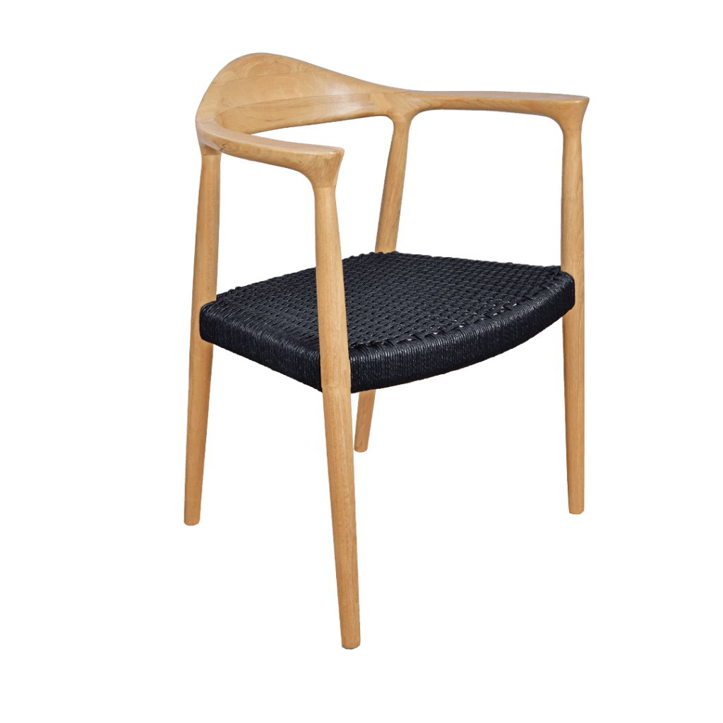 Dive in modern elegance with this solid wood dining chair featuring a woven rattan seat and graceful arms. The Kennedy's sculptural design merges Scandinavian simplicity with outdoor-indoor versatility, perfect for elevating any dining space.