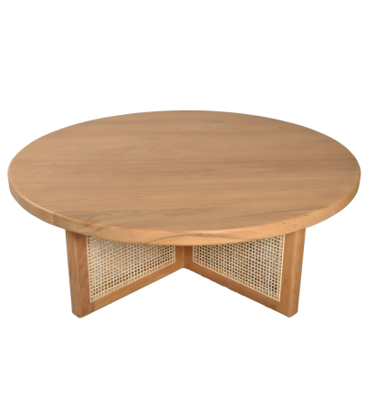 The round wooden coffee table showcases exceptional craftsmanship with its perfectly proportioned circular top and distinctive X-base design. As a natural wood coffee table, it celebrates the inherent beauty of teak, featuring subtle grain patterns and warm tones that add organic charm to your space.