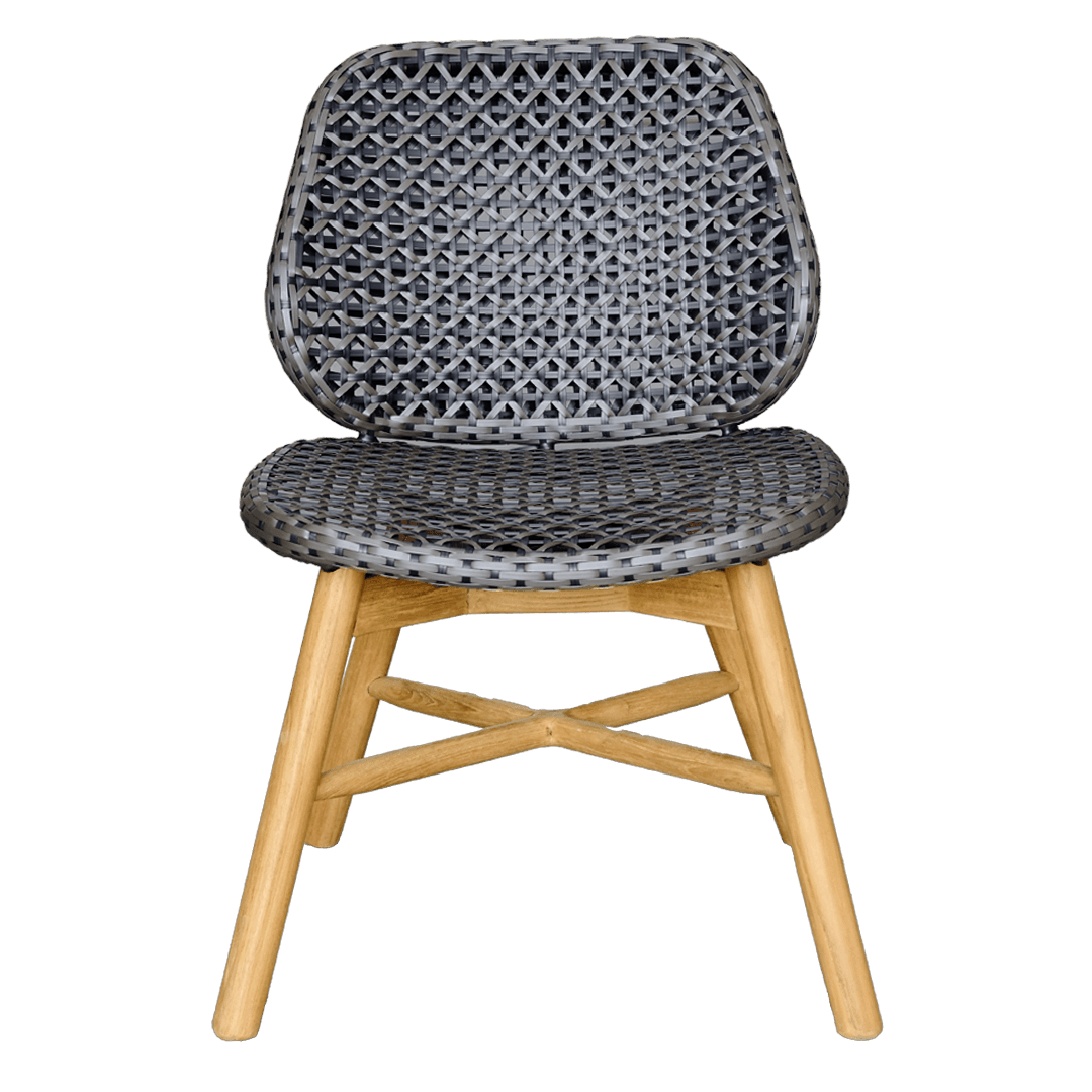 The Angela Dining Chair merges contemporary design with practical comfort. The distinctive charcoal gray polystrap weave creates an intricate geometric pattern across both seat and backrest, offering a modern take on traditional rattan styling.