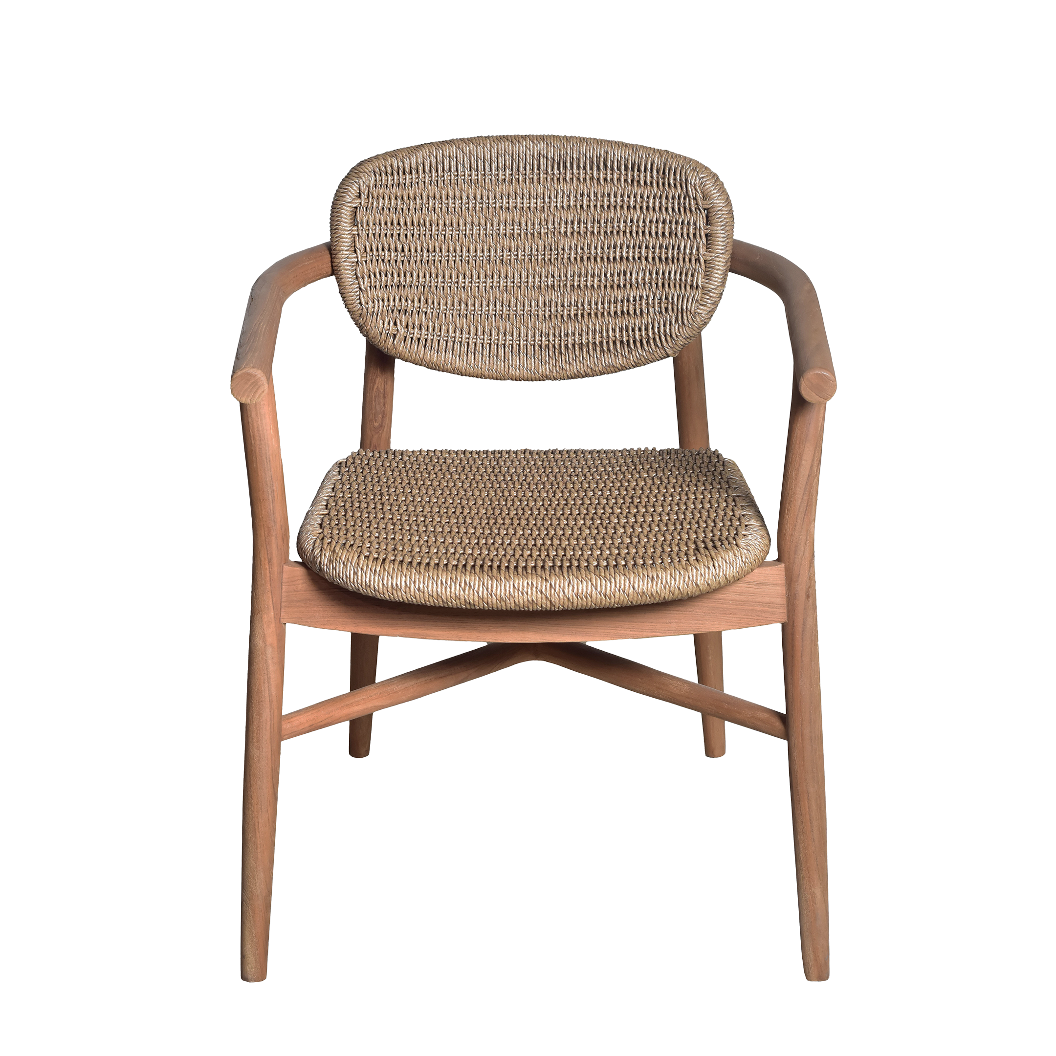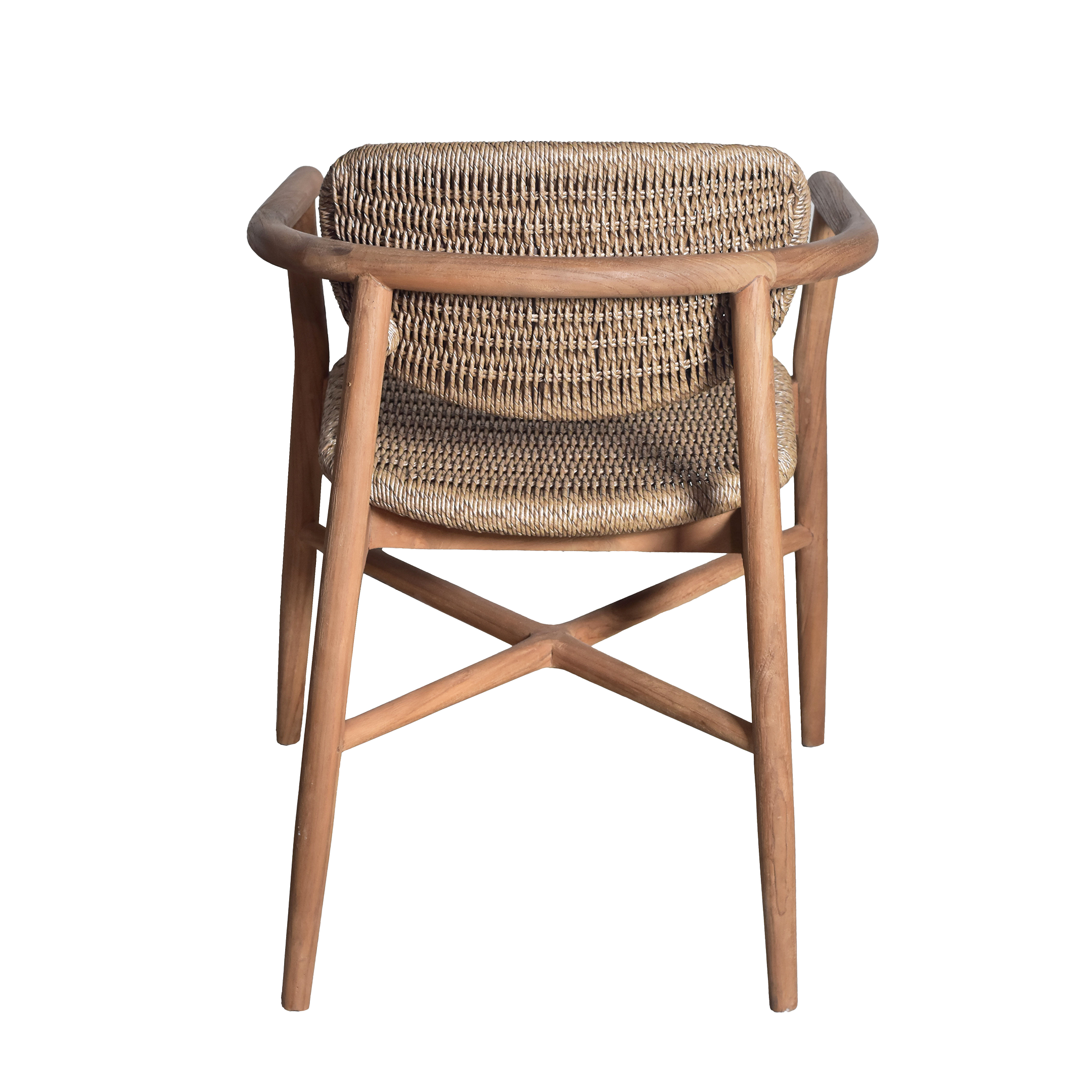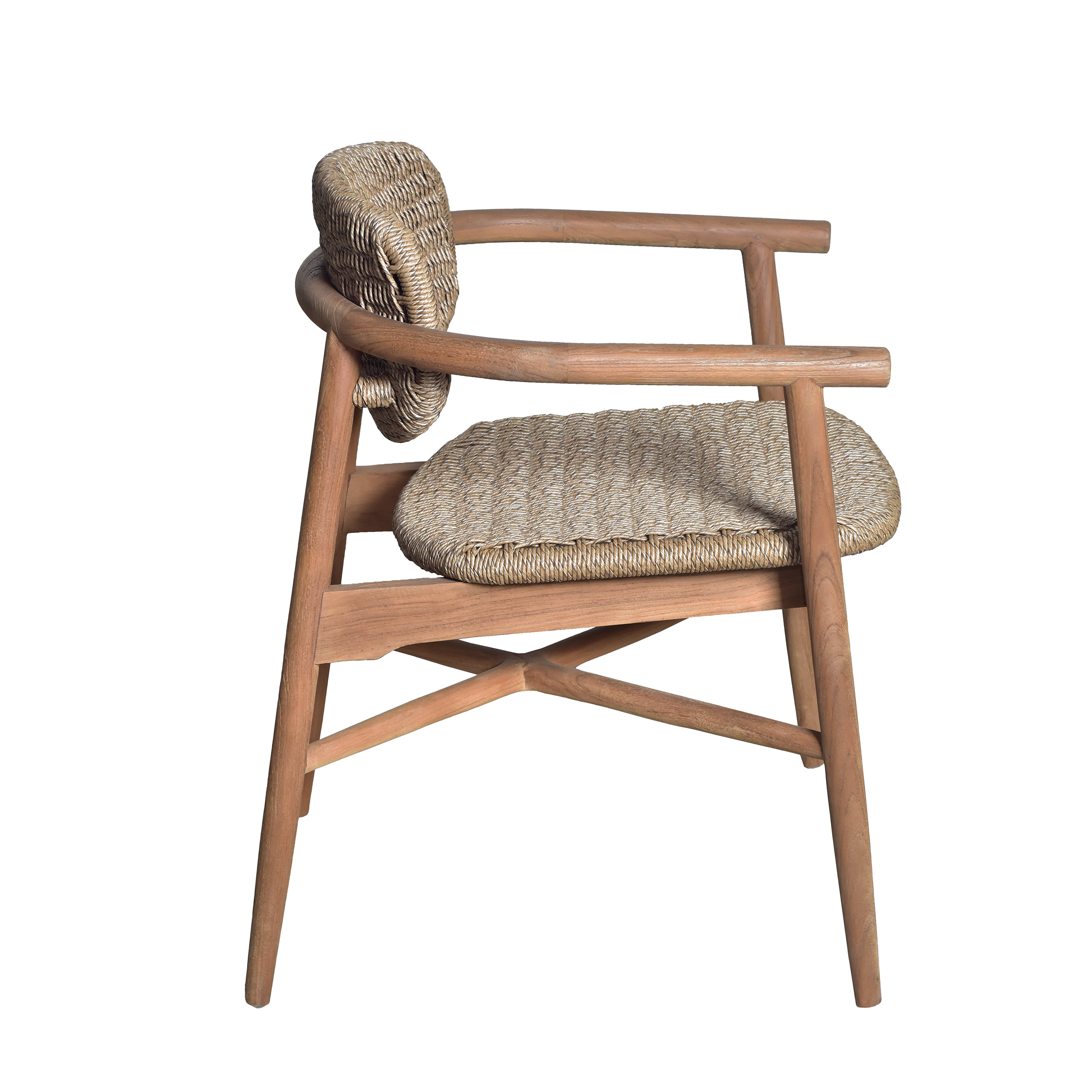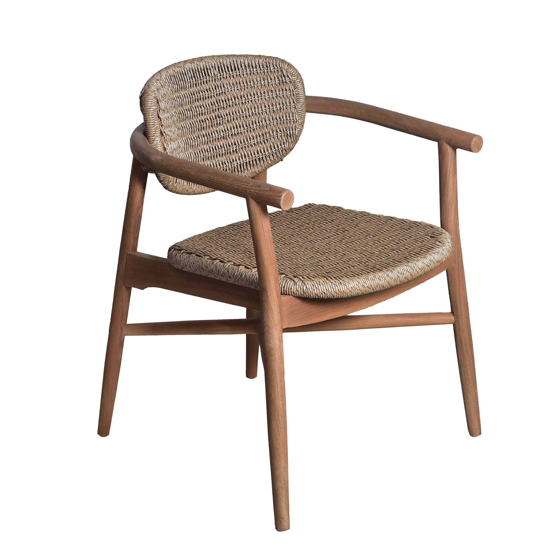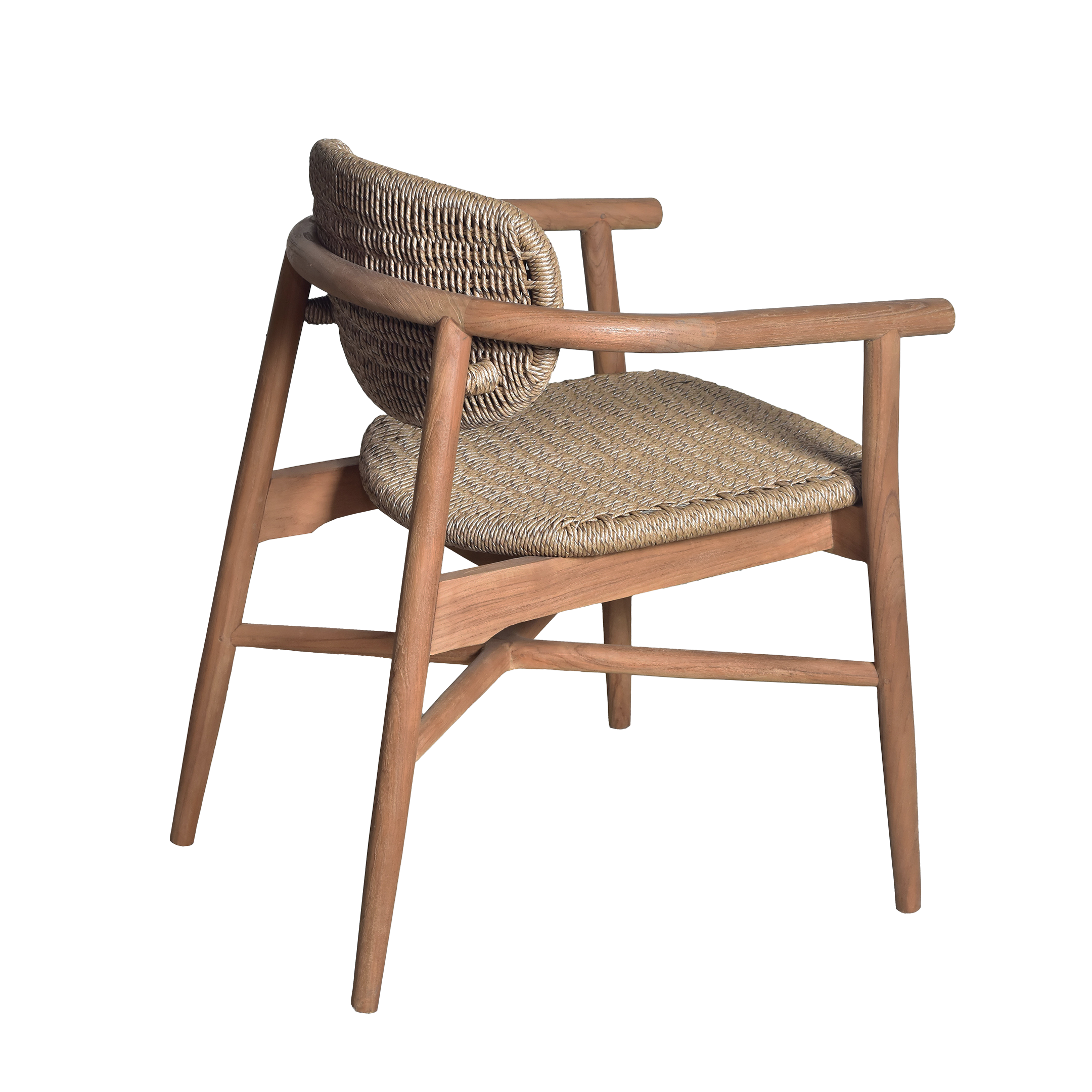 The Bora Bora Armchair is a tribute to island-inspired luxury and refined minimalism. Expertly crafted from high-grade solid teak, this chair features a signature curved backrest and seat, both meticulously detailed with intricate hand-woven rope for a breathable and textured feel.