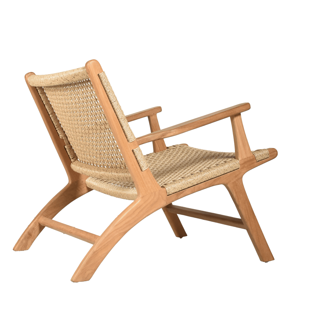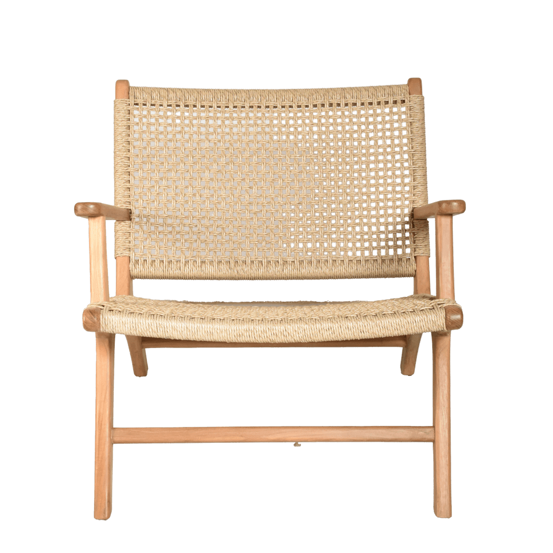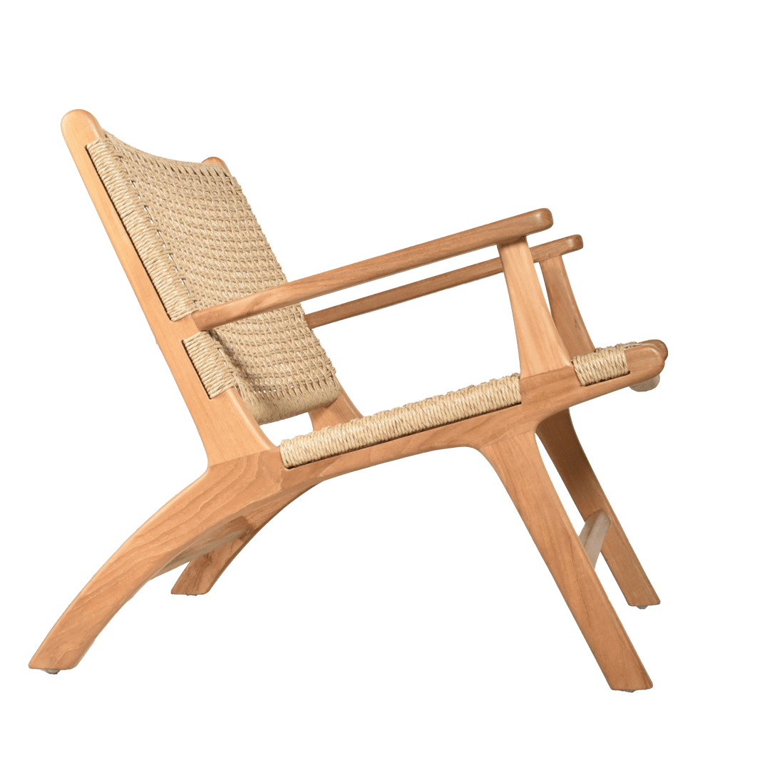 Its sturdy wooden frame, crafted from high-quality teak, boasts smooth, curved lines that exude warmth and sophistication. The seat and backrest are skillfully handwoven, creating a textured, breathable surface that enhances both comfort and visual appeal. With its ergonomic design and generous armrests, this chair is as practical as it is stylish, inviting you to sit back and unwind in style.