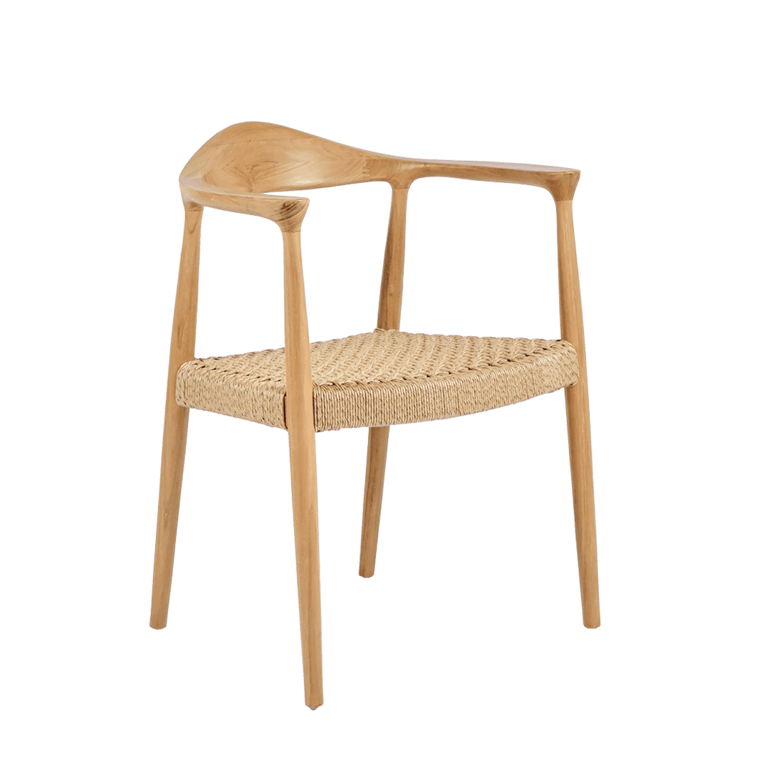 Dive in modern elegance with this solid wood dining chair featuring a woven rattan seat and graceful arms. The Kennedy’s sculptural design merges Scandinavian simplicity with outdoor-indoor versatility, perfect for elevating any dining space.