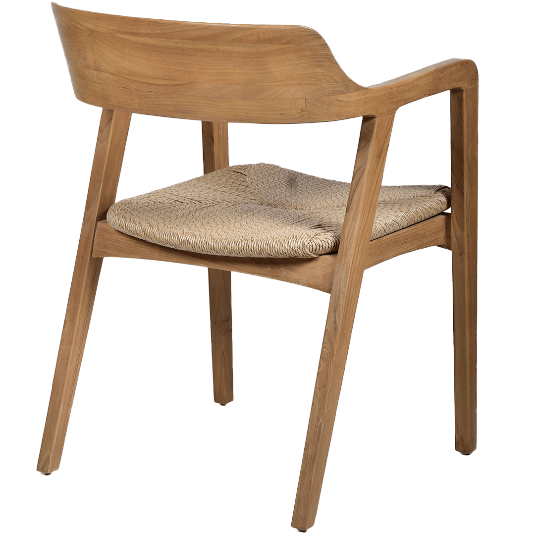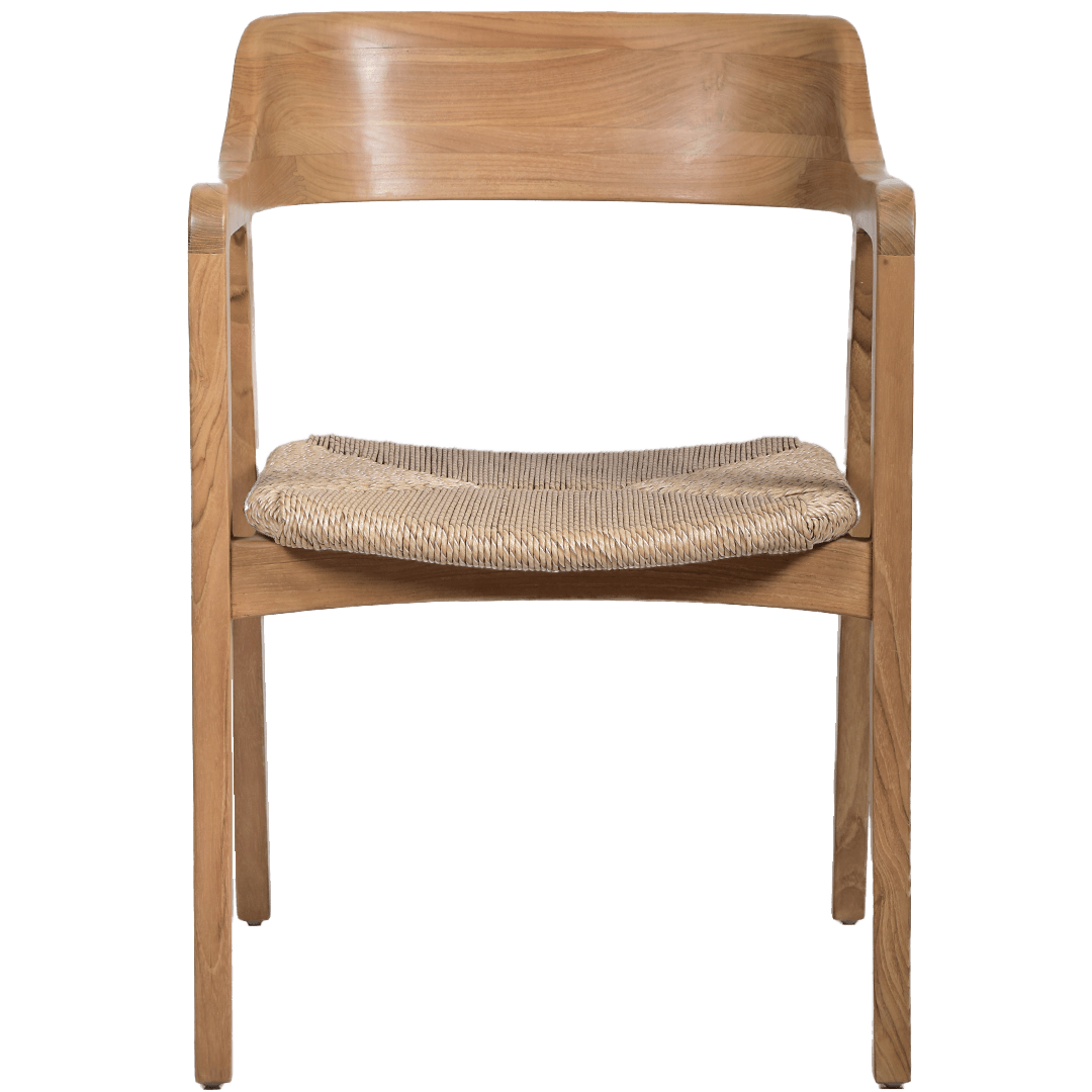 The Kezia Dining Armchair combines a smooth wooden frame with a beautifully woven rattan seat, offering both style and comfort. Its modern design includes ergonomic dining chair arms, making it a versatile choice for dining rooms or outdoor dining areas. The durable construction ensures it complements any setting with elegance and functionality.
