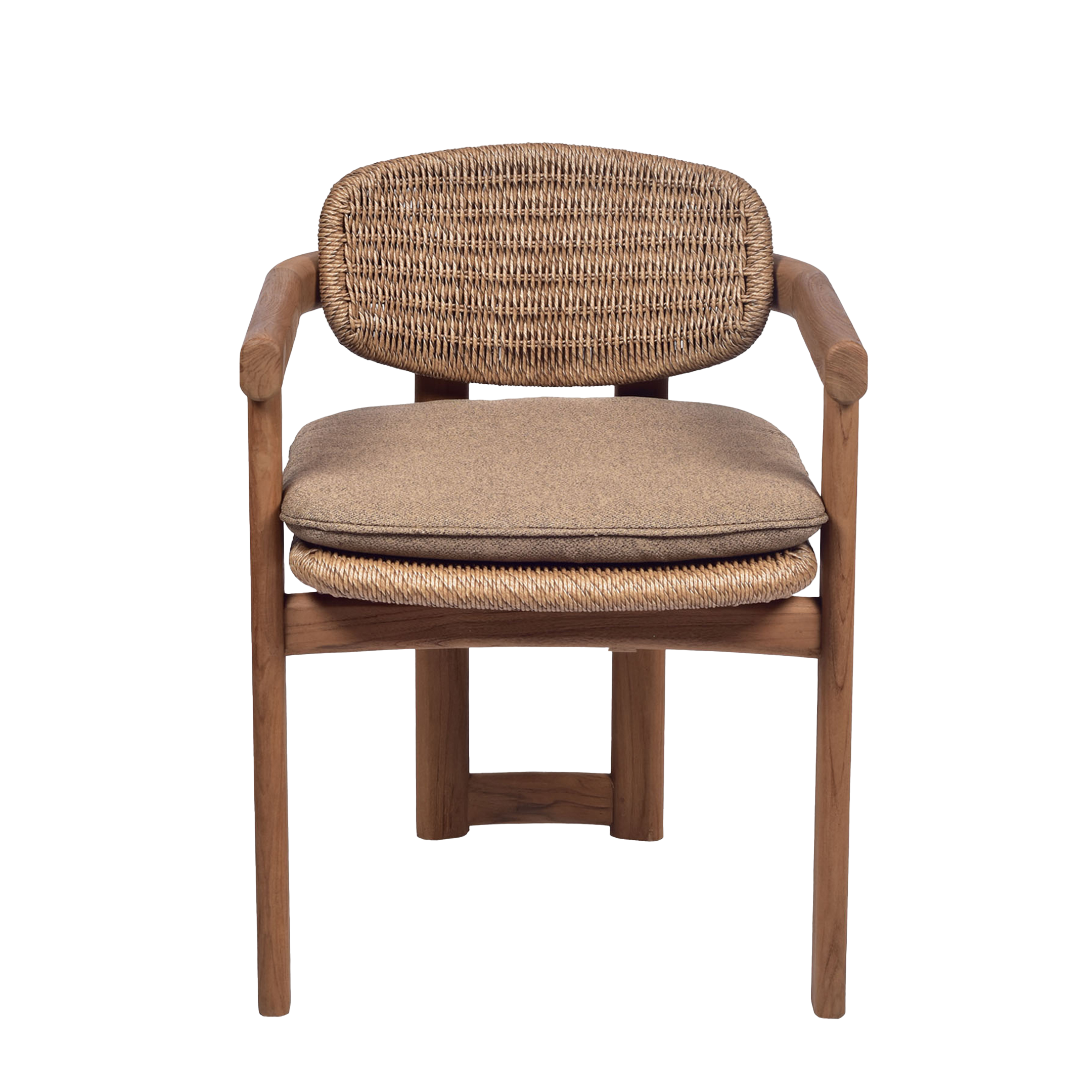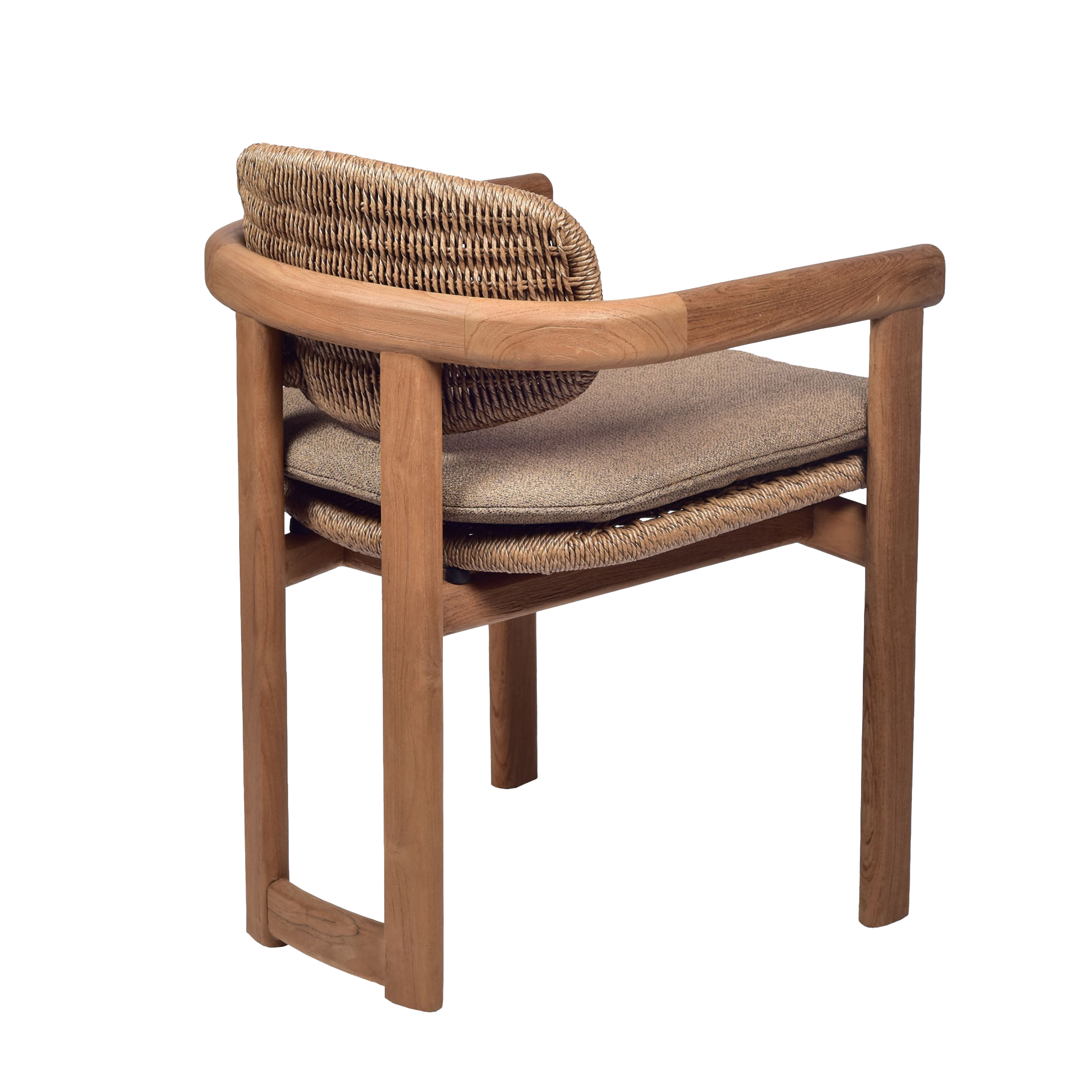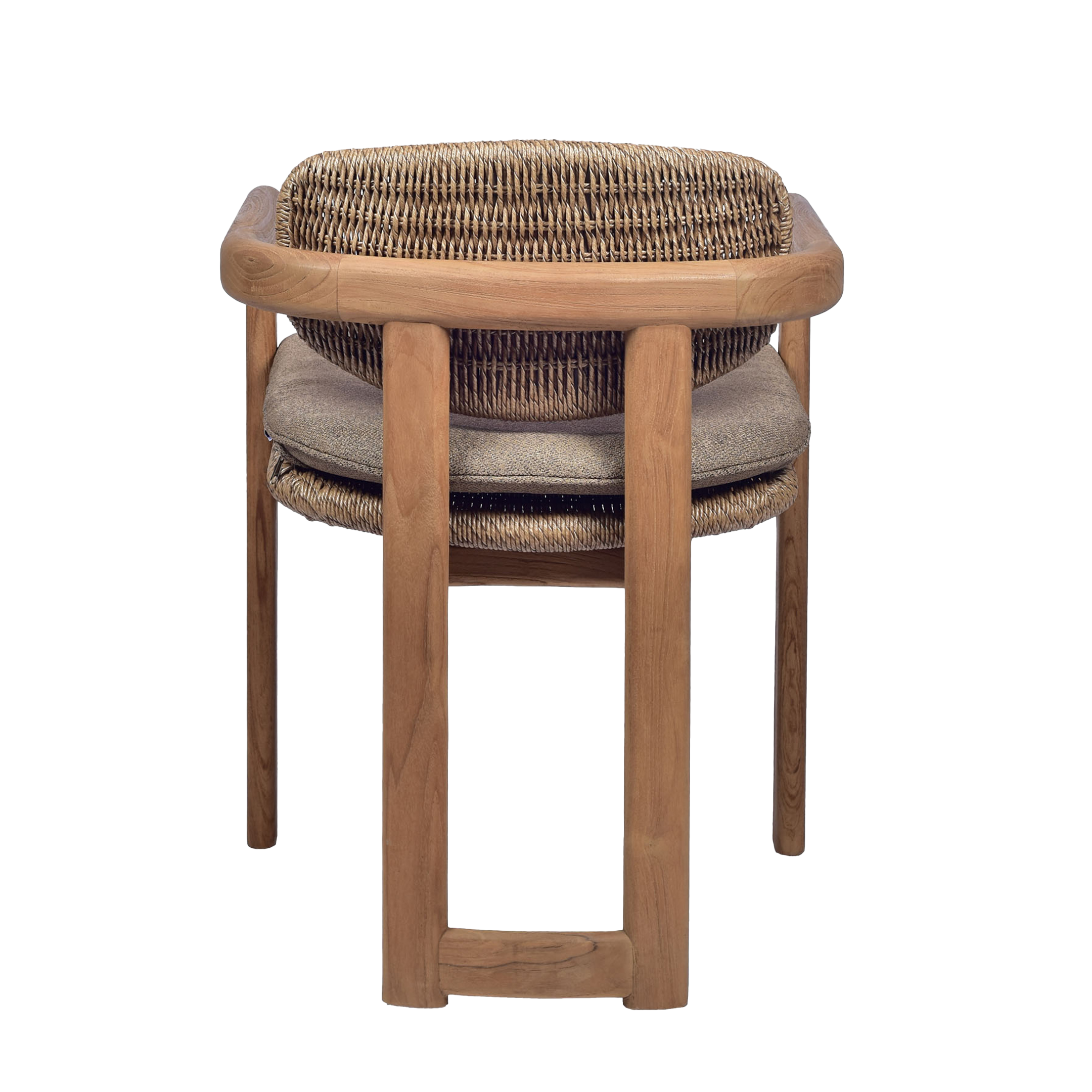 The Messina Dining Armchair is a masterclass in organic modern design. Crafted from premium solid teak, it features a signature wraparound backrest with intricate, hand-woven rope detailing that provides both breathability and a striking textured aesthetic.