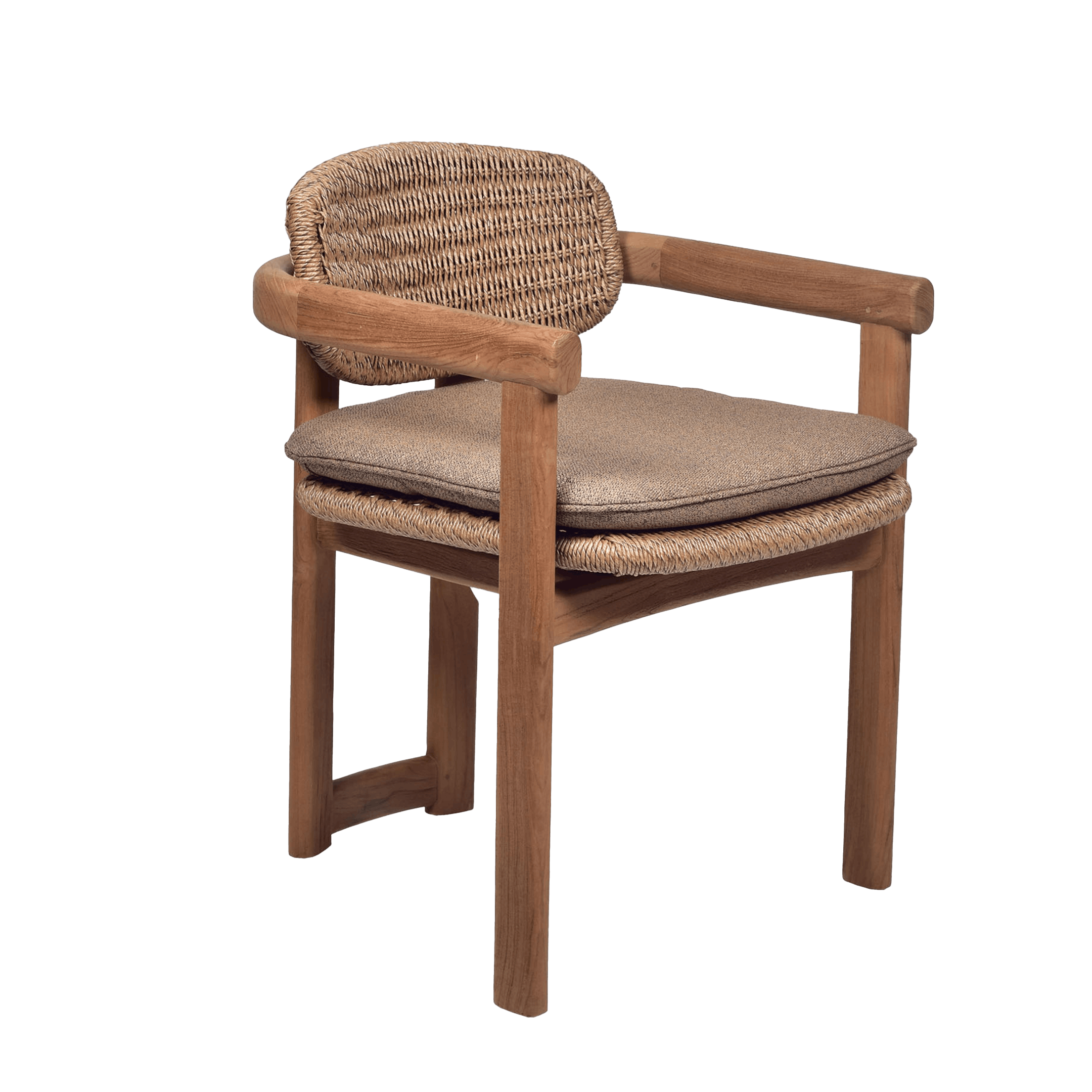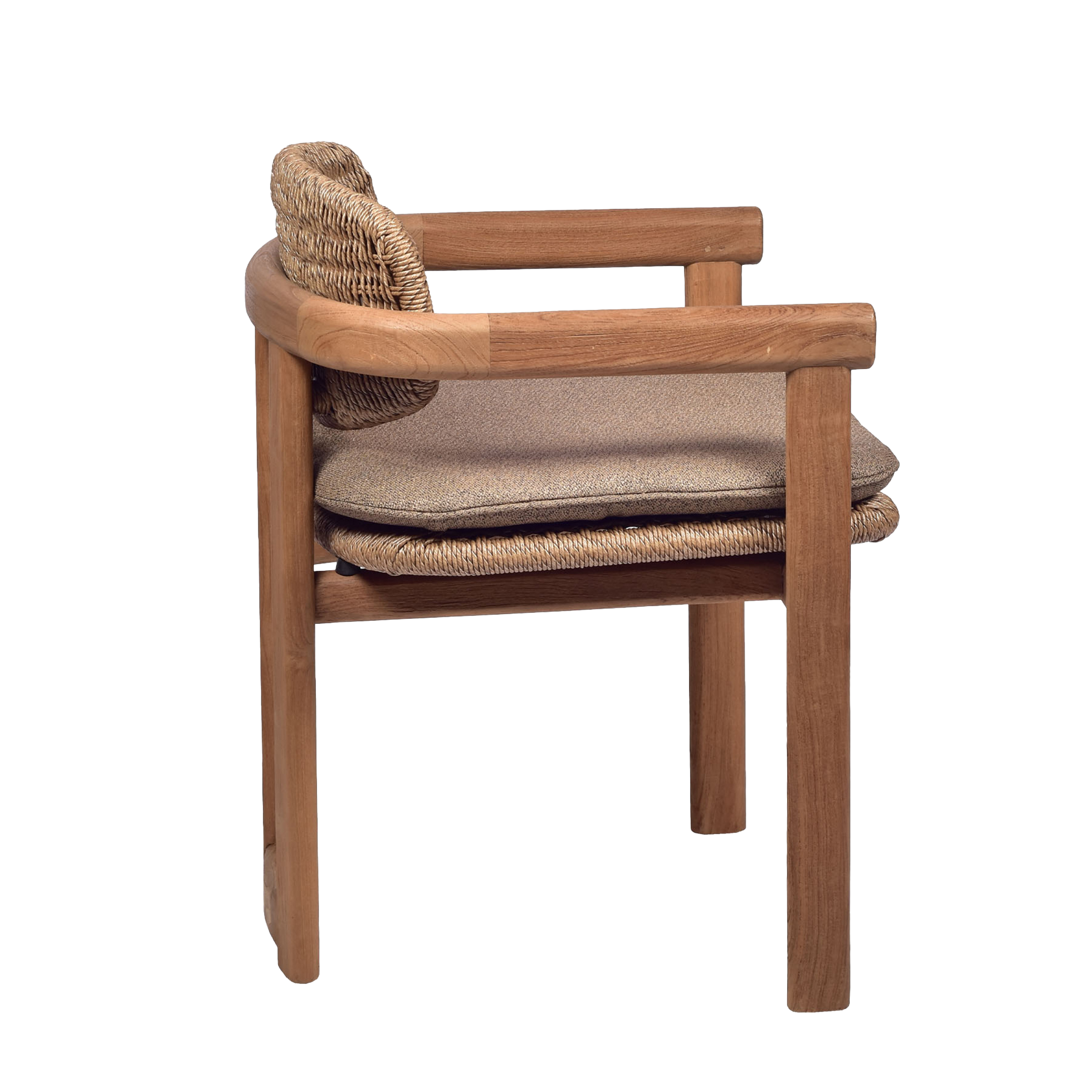 Designed for long, comfortable gatherings, the chair’s curved silhouette and integrated armrests offer superior ergonomic support. Its warm teak grain and neutral tones make it a versatile centerpiece, seamlessly blending tropical luxury with contemporary sophistication.