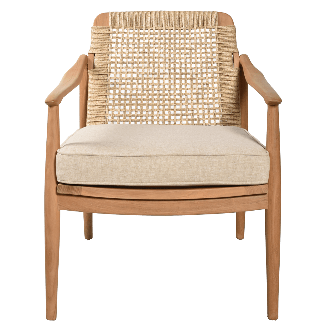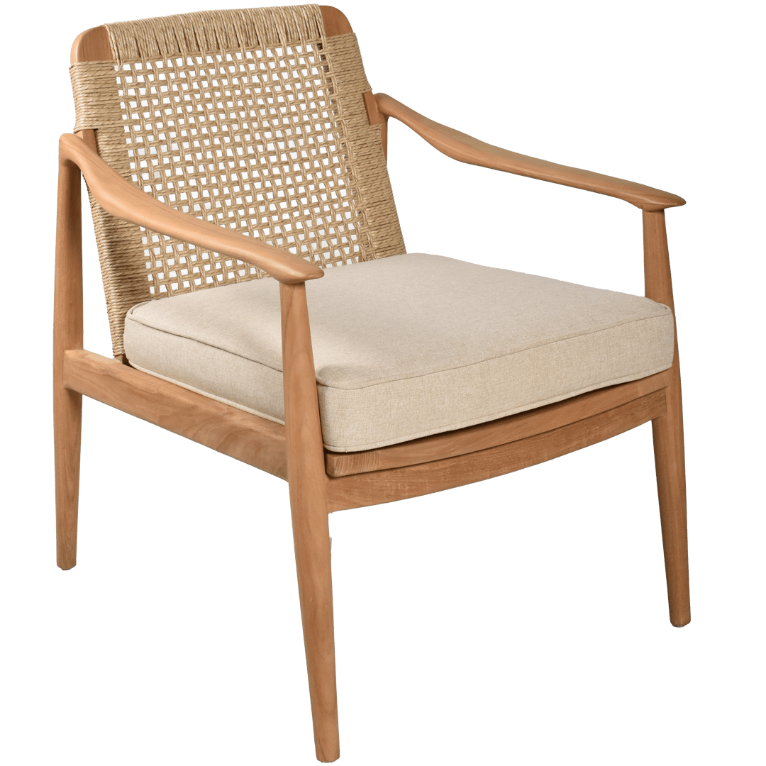 The carefully crafted teak wood frame showcases clean lines and architectural details that elevate any space, while the intricate cane webbing adds natural texture. Whether placed in your living room or covered patio, this lounge chair exterior makes a striking statement. The weather-resistant lounge chair cushions outdoor ensure lasting comfort and durability, while the neutral tones complement any décor style.